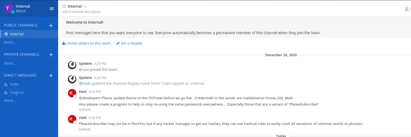 After a bit of searching we can find numerous messages from root that mention the user maildeliverer with the password Youve_G0t_Mail!.