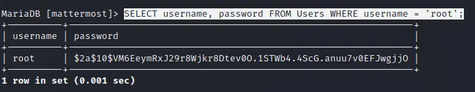 We can use the acquired account to log into the server via SSH and retrieve the user flag. By enumerating the server further the file /opt/mattermost/config/config.json can be found. It includes the DB user mmuser and the password Crack_The_MM_Admin that can be used to retrieve hashed root user credentials. After logging into MariaDB with mysql -u mmuser -D mattermost -p the data can be retrieved by executing SELECT username, password FROM Users WHERE username = 'root';.