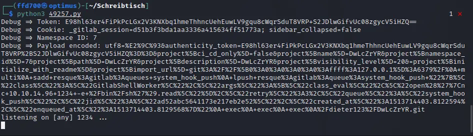 The password works on the gitlab root account, root -i wW59U!ZKMbG9+*#h does the trick. But we are still in a docker container and can't access the root directory. Follow the guide and change the ps aux to whatever command you want to execute. In our case cat /root/root.txt, the command output can be found in /output.