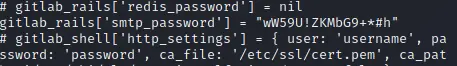 After a bit of enumeration, the directory /opt/backup with a bunch of interesting files can be found. With the help of grep -i pass gitlab.rb the files reveal a password.