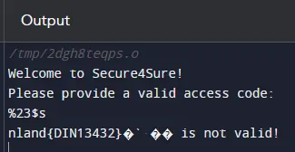 We get C code, which appears to be the login for Secure4Sure. The user can enter an access code, and the program compares it with the hardcoded string at the beginning of the program. The user input looks like a suitable attack vector because it is printed later in the program. The fgets() function reads a line of the specified input stream and stores it in the buffer variable. These are the perfect conditions for a format string attack that uses printf() features. For example, the string to be output can be manipulated using special commands such as %s or %d. printf("My %s is", name). %s which expects a string is replaced by the contents of the name variable. Printf() reads the previous address from the stack. So if we typed printf(%s %s) we would get the last two strings on the stack. However, if this input is longer than the maximum length defined in fgets(), we get a segment fault. Another string format feature is %<nth address>$s, which jumps directly to the specified point in the stack. If we write %p as input, the program returns the pointer address. With this address, you can look at the stack and calculate the offset. A more straightforward method that does not require precise knowledge of the stack and how it works is fuzzing. Here, you can try out all offsets until the access code is output. With the locally used compiler, the correct offset was %23$s.