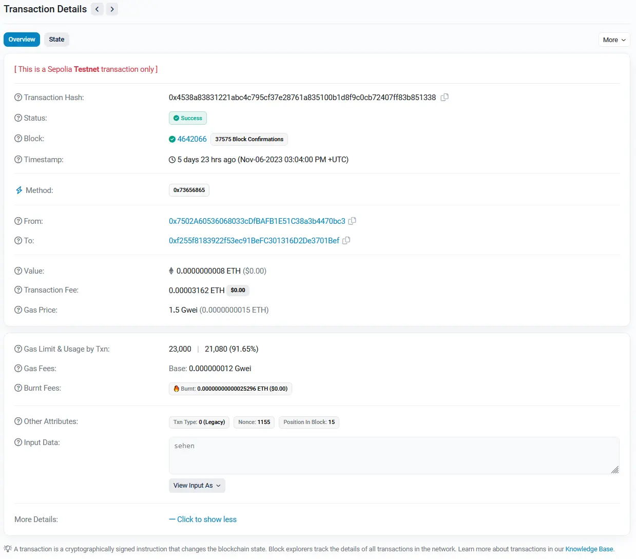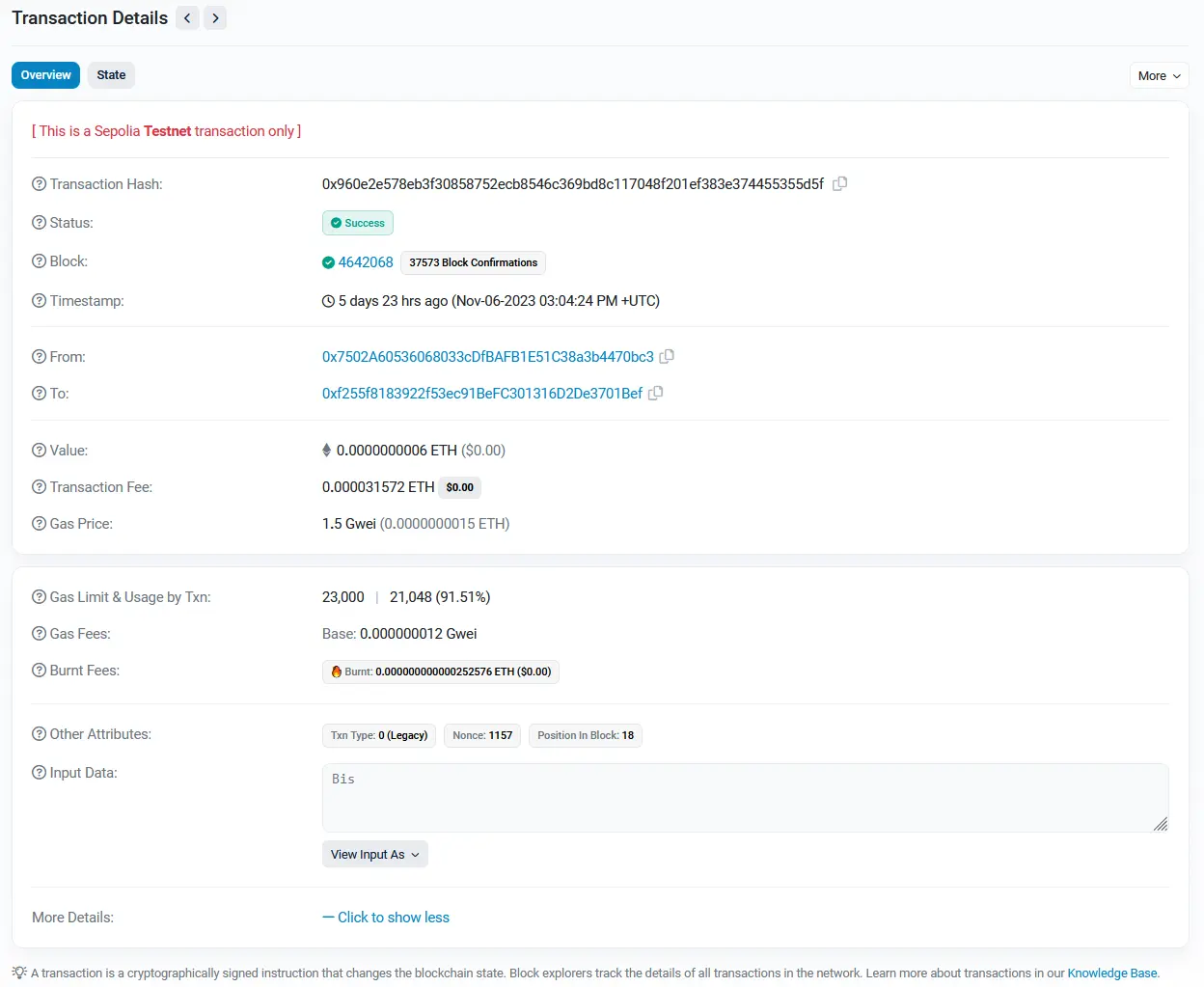 We have only received the string 0x7502A60536068033cDfBAFB1E51C38a3b4470bc3 to solve the challenge. This looks like a 42-character hexadecimal Ethereum address. By using Etherscan, a blockchain explorer and analytics platform for Ethereum, we can track and analyze transactions associated with our address on the Sepolia testnet. We discover a total of 1169 transactions. By inspecting some transactions, we notice that transactions were sent from '0x7502A60536068033cDfBAFB1E51C38a3b4470bc3' to '0xf255f8183922f53ec91BeFC301316D2De3701Bef'. Each transaction appears to have a value assigned to its 'Input Data' field.