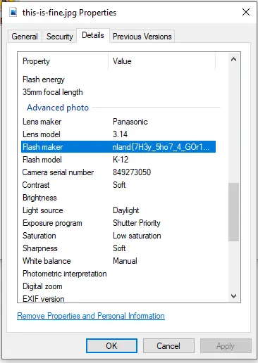 We get what appears to be a typical JPG image. Metadata is one of the first places to look for steganography. In this case, the flag is hidden in the Exif tag Flash maker. Exif is a standard format for storing metadata in digital images. The tag can be viewed using the strings or exif command on Linux or the Explorer Properties on Windows.