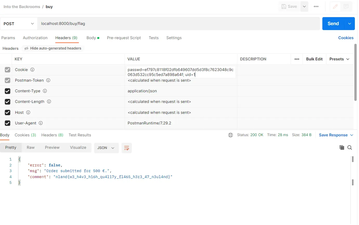 })We need to send a post request to the endpoint /buy/flag. The body needs to contain a JSON with the fields quantity and price. The two cookies passwd and uid need to be set as well to the values of the created account. The response will then contain a comment with the second flag. An order cookie is set with the response as well.