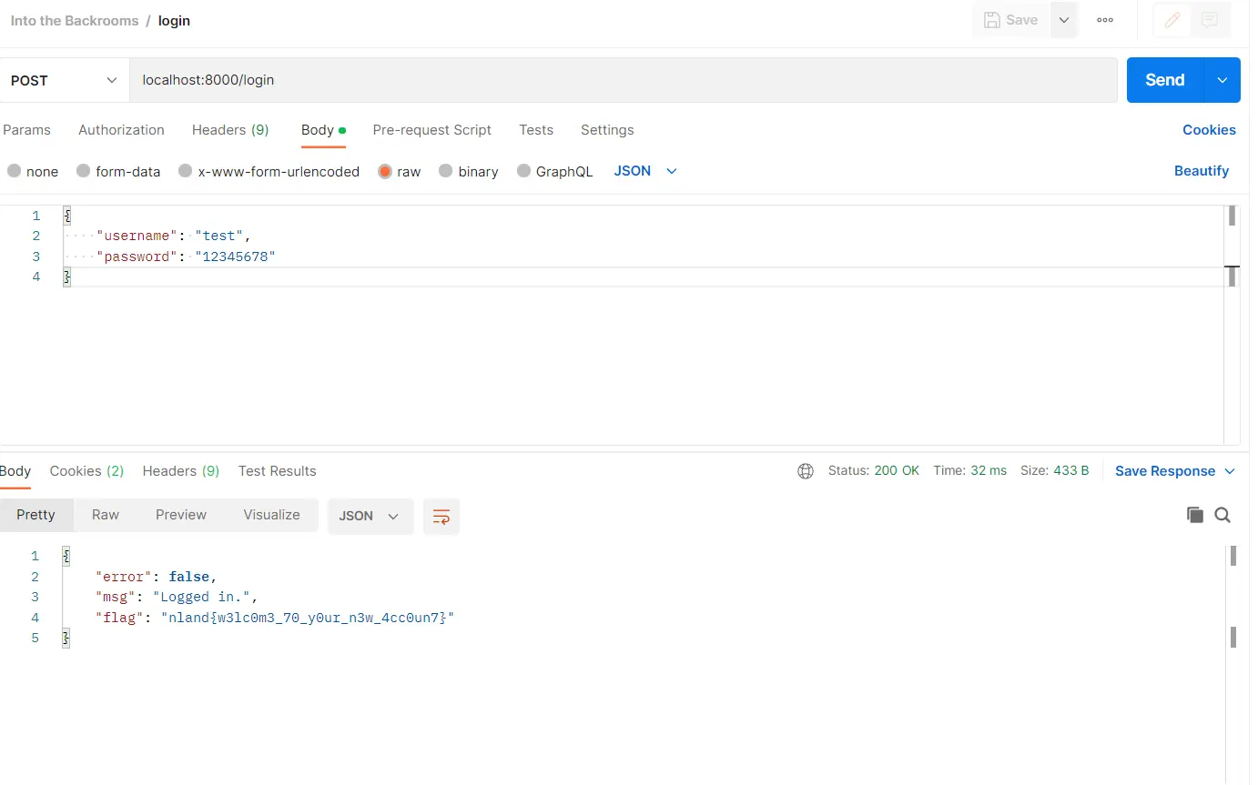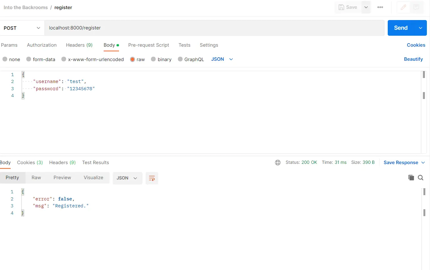As already expected we have to focus on the backend. For this sake I am going to use Postman to send the requests. The task tells us to log into an account. We have to register a new account and log into it.